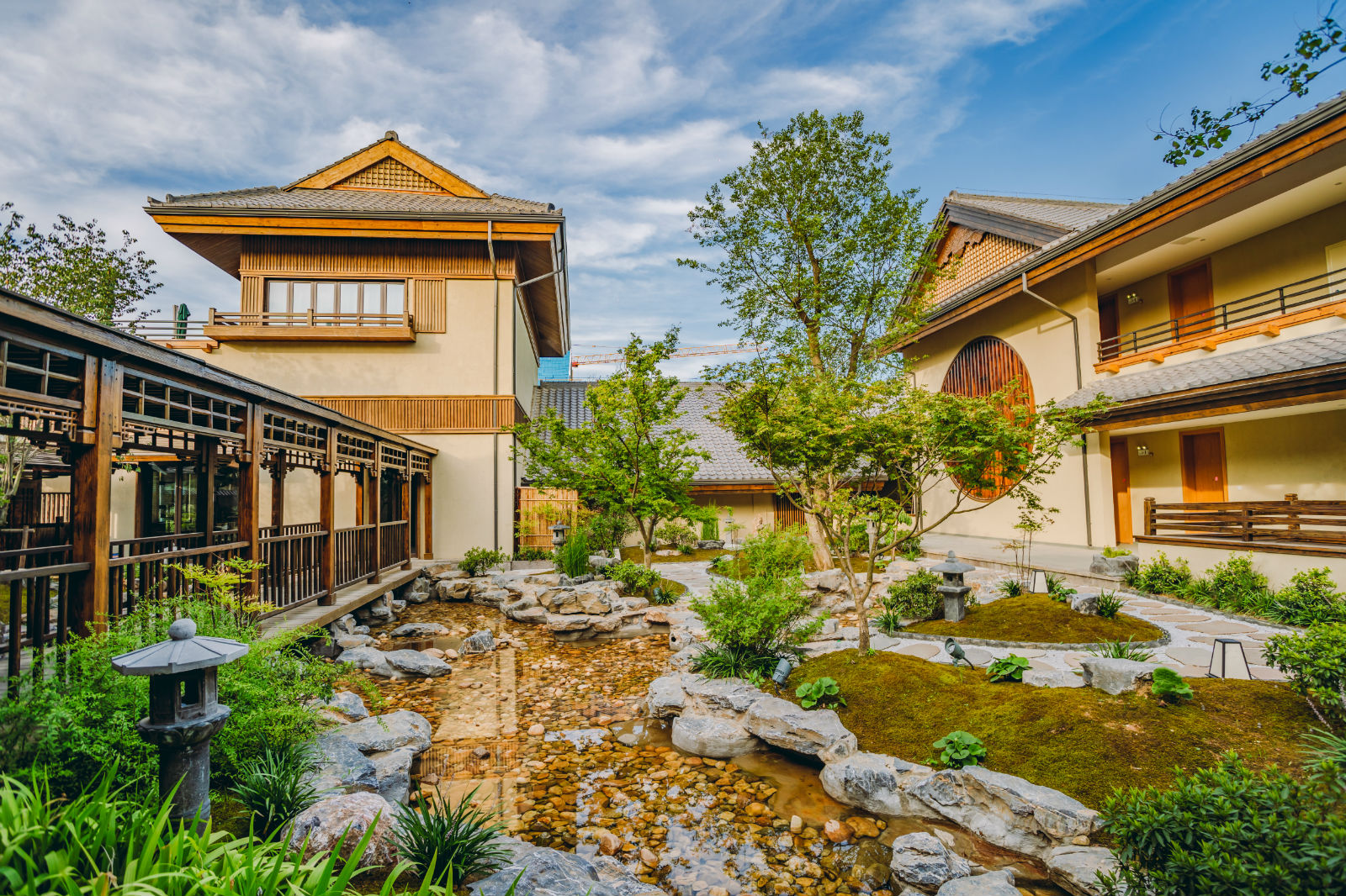 該項目位于黃梅縣東山腳下,五祖寺景區內,項目總用地面積約13萬平方米,總建筑面積約5.2萬平方米。項目包括菩提精舍、禪意商街、禪居客棧等功能區。作為景區內第一目的地,它是一座游覽景區,也是一座產業社區,還是一座創意產業園區;可觀光旅游,又可安家入住,可旅游度假,又可創業就業,是集朝拜、祈福、修禪、休閑、度假、生態有機產業等功能于一體,特質鮮明卻又高度開放包容的泛小鎮。建筑中,融入了無我、無相、無限、出世、寂靜、超然六大禪意要素,將東方禪意中的含蓄包容、寧靜淡泊體現其中,使整個建筑彰顯崇尚自然、親近寂定、肅穆嚴整、空相悠遠的禪意空間精神。
