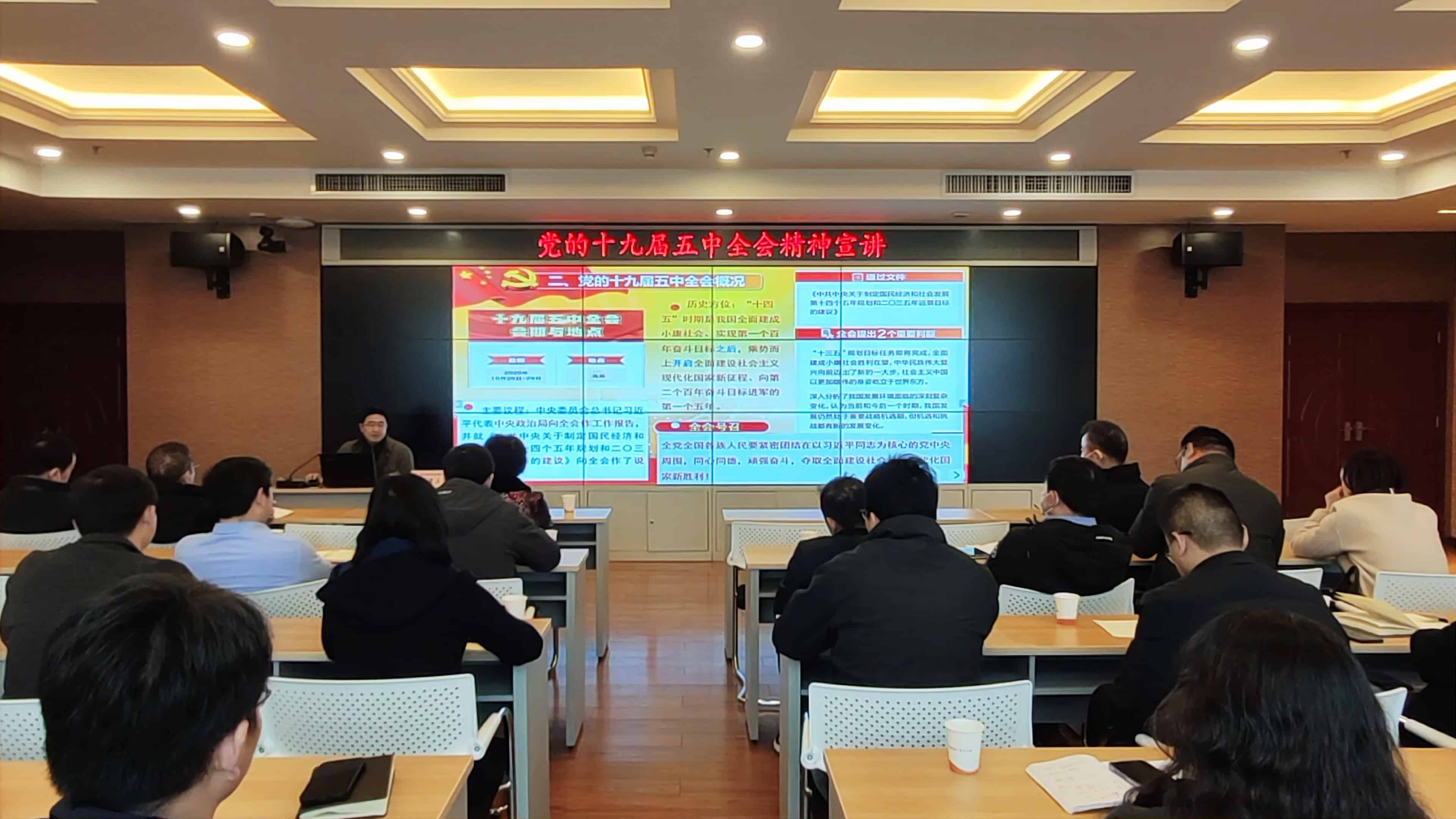 ? ? ? 12月26日上午,黨的十九屆五中全會精神宣講活動在集團18樓會議室舉行,宣講邀請了武漢市社科院政法所所長、市委宣講團成員田祚雄進行專題授課。漢陽市政黨委成員代表、各支部書記、副書記等相關人員參加了此次活動。