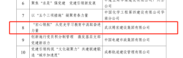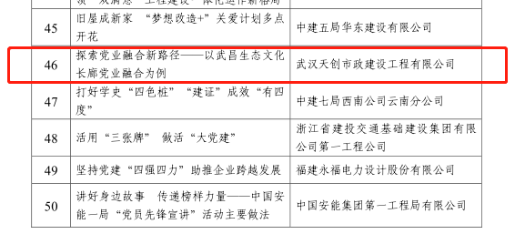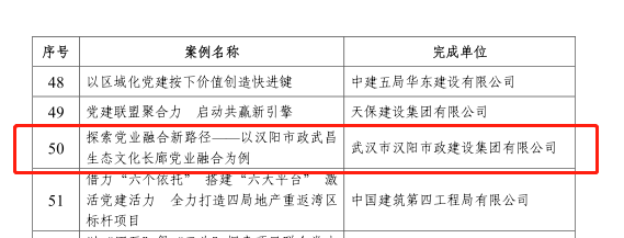 近日,中國(guó)施工企業(yè)管理協(xié)會(huì)發(fā)布《關(guān)于推廣工程建設(shè)企業(yè)黨建工作最佳案例和優(yōu)秀案例的通知》,漢陽(yáng)市政3項(xiàng)黨建案例榜上有名。其中,《探索黨業(yè)融合新路徑—以漢陽(yáng)市政武昌生態(tài)文化長(zhǎng)廊黨業(yè)融合為例》成功入選工程建設(shè)企業(yè)黨建工作最佳案例,《探索黨業(yè)融合新路徑—以武昌生態(tài)文化長(zhǎng)廊黨業(yè)融合為例》《“宏心領(lǐng)航”,從黨史學(xué)習(xí)教育中汲取奮進(jìn)力量》入選工程建設(shè)企業(yè)黨建工作優(yōu)秀案例