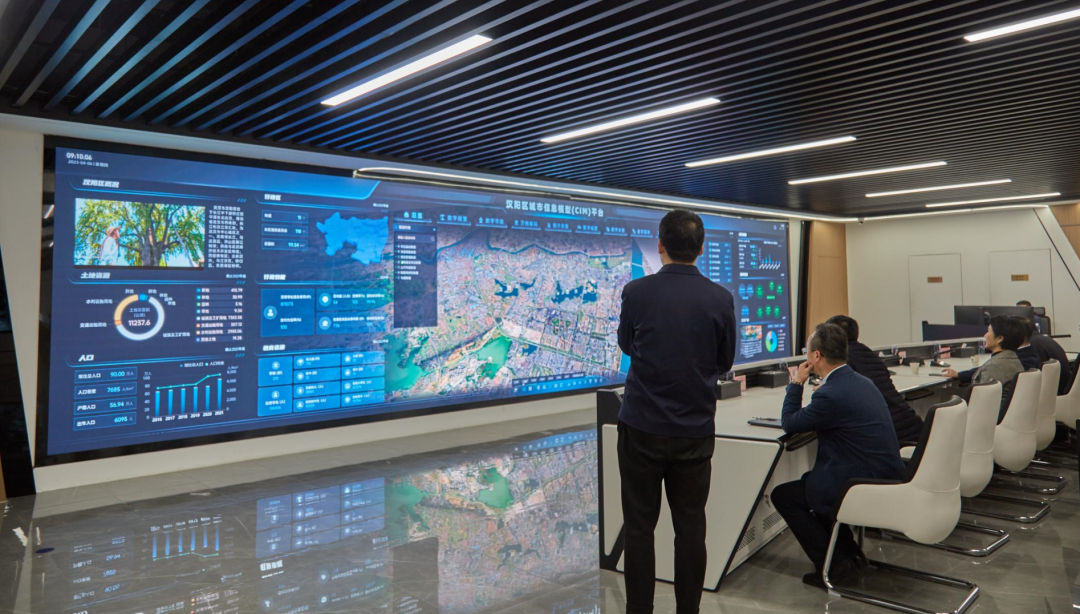陳勁超一行來到漢陽市政建設大廈,參觀漢陽市政數智化管理中心,聽取了漢陽區城市數字公共基礎設施建設情況的匯報,并就漢陽區城市信息模型(CIM)平臺項目的建設及運營情況進行現場交流。