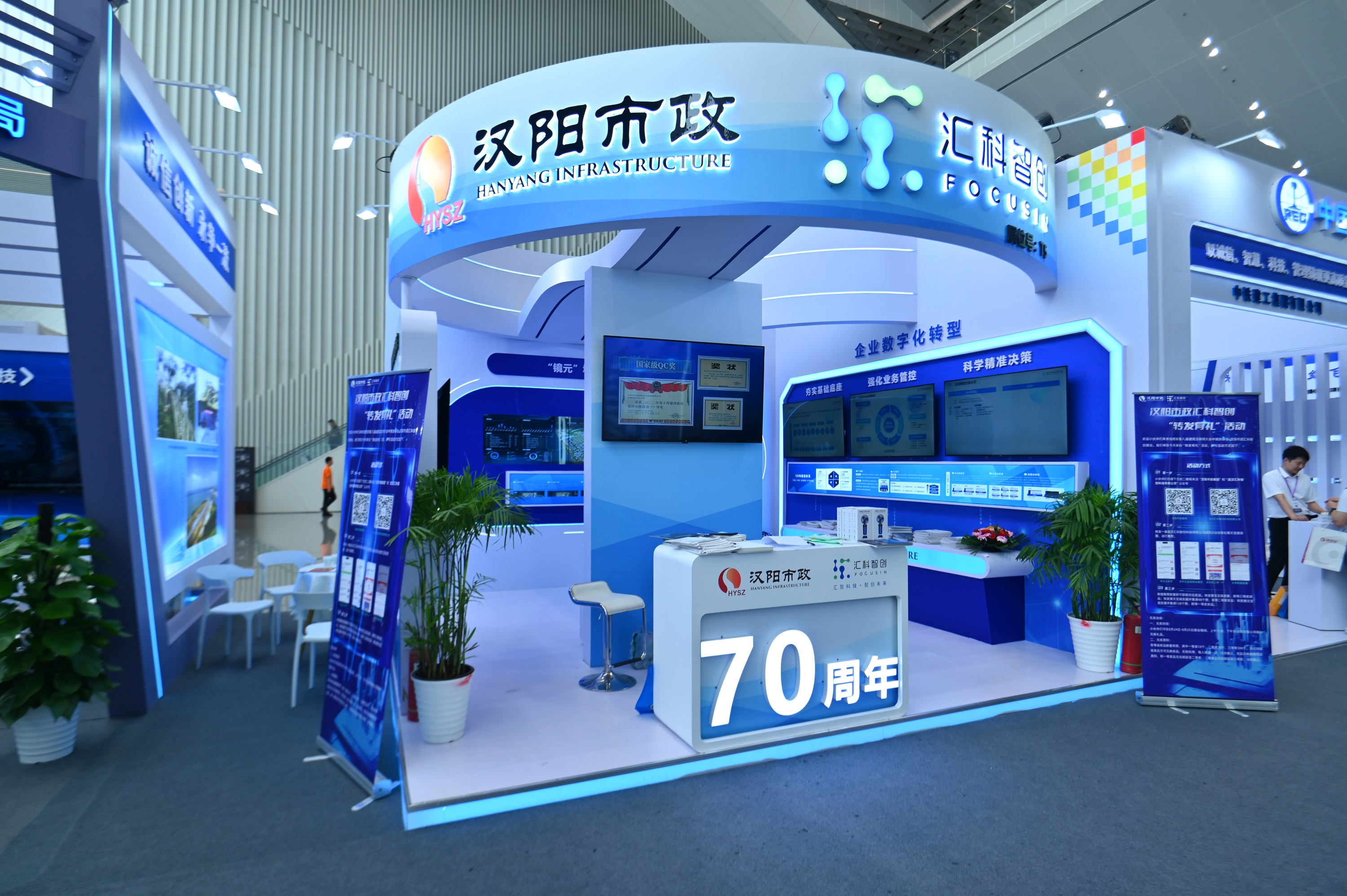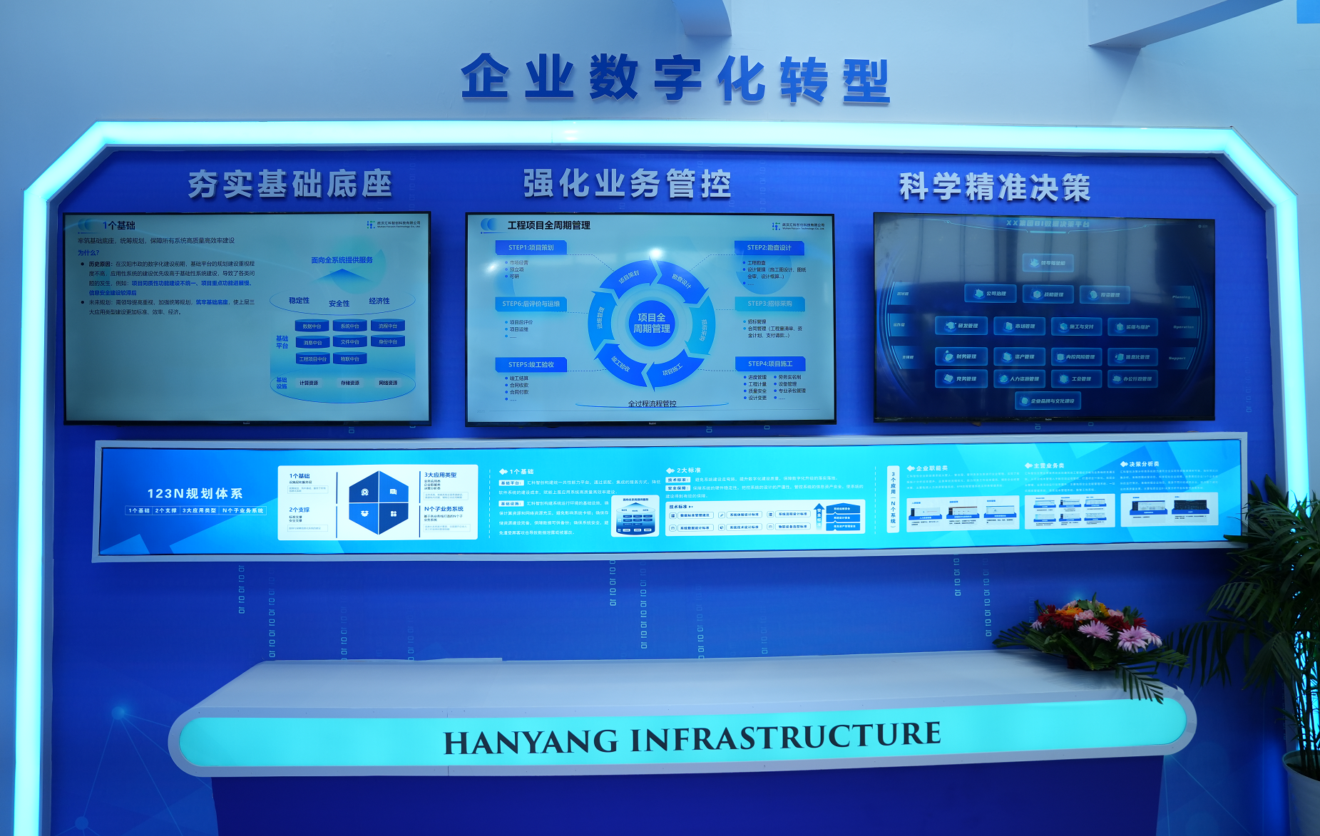 漢陽(yáng)市政展臺(tái)融合了70周年以及信息技術(shù)等元素,展現(xiàn)公司在數(shù)字化軟件研發(fā)、智能集成、數(shù)字孿生等領(lǐng)域的實(shí)力。在企業(yè)數(shù)字化轉(zhuǎn)型板塊,講述公司圍繞工程建設(shè)行業(yè)企業(yè)數(shù)字化轉(zhuǎn)型需求,賦能傳統(tǒng)建筑企業(yè)的成果。以企業(yè)內(nèi)部高效協(xié)同辦公、工程項(xiàng)目全周期智慧化管控為目標(biāo),打造企業(yè)IT品牌矩陣,提升科學(xué)戰(zhàn)略規(guī)劃、智慧項(xiàng)目管理、綜合數(shù)據(jù)運(yùn)營(yíng)等核心數(shù)字化能力,通過(guò)數(shù)字化轉(zhuǎn)型實(shí)現(xiàn)彎道超車、產(chǎn)業(yè)轉(zhuǎn)型升級(jí),提高企業(yè)核心競(jìng)爭(zhēng)力。