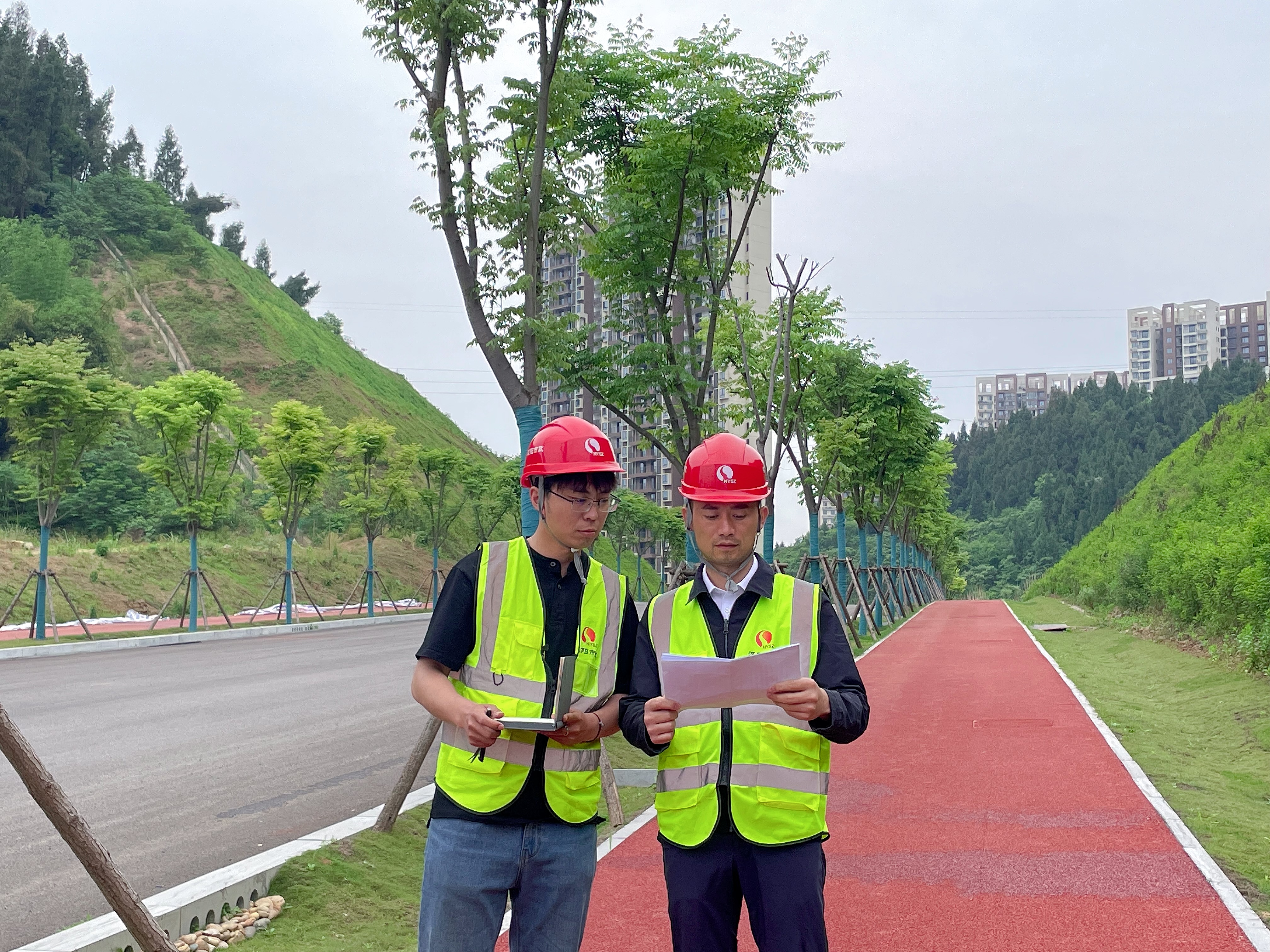 李苗(右)帶班檢查工地