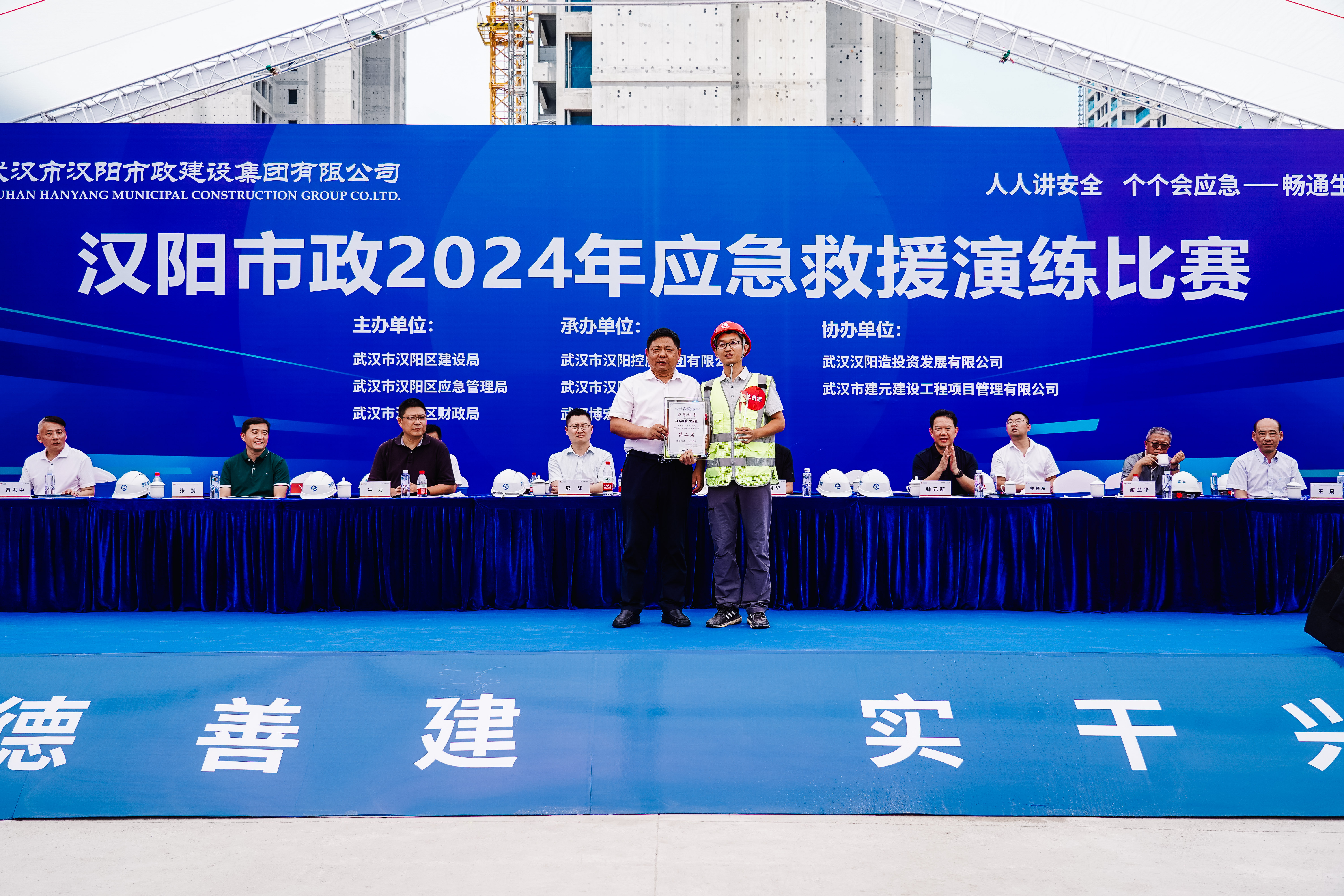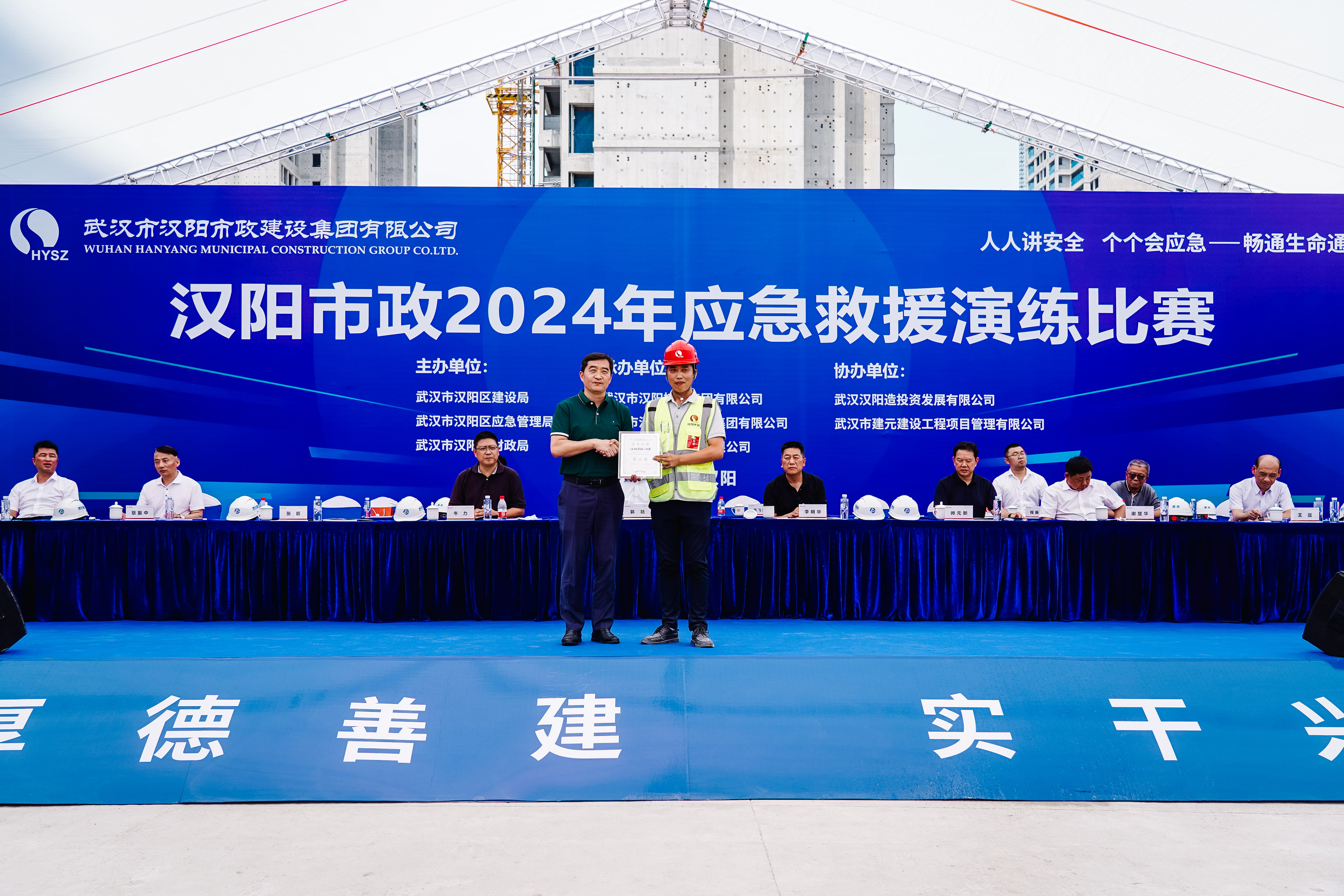 本次比賽特邀省應(yīng)急管理廳救援協(xié)調(diào)和預(yù)案管理局局長李明華,省住建廳質(zhì)安處副處長帥元新,省建設(shè)工程質(zhì)量安全監(jiān)督總站安全科科長郭陸,武漢市應(yīng)急管理局副局長謝楚華,武漢市建設(shè)工程安全監(jiān)督站副站長牛力,漢陽區(qū)建設(shè)局局長朱源松、應(yīng)急管理局局長張鵬、建管站站長王晟、財(cái)政局、漢陽控股、漢陽投發(fā)等出席活動(dòng)。